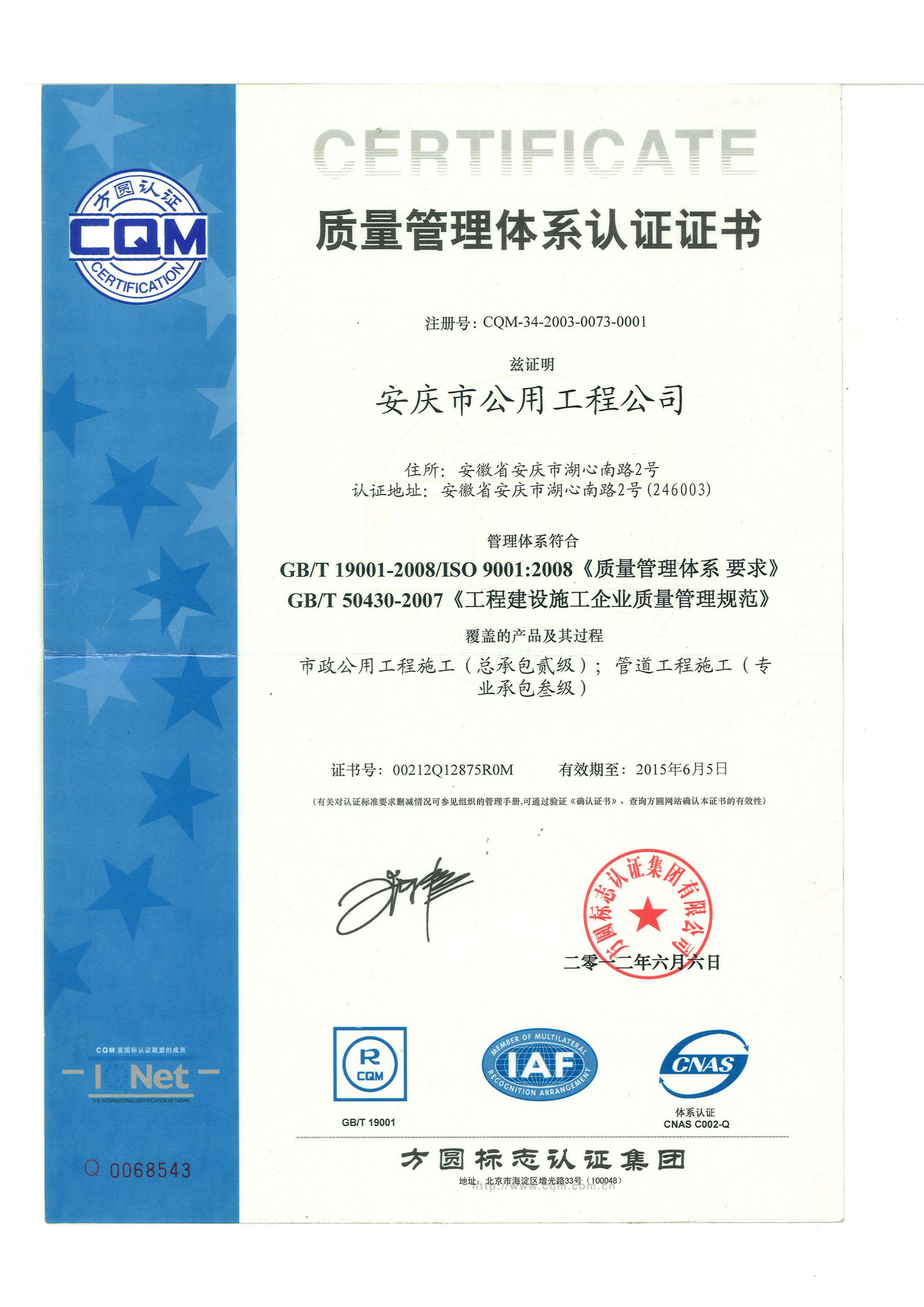 質(zhì)量管理體系證書